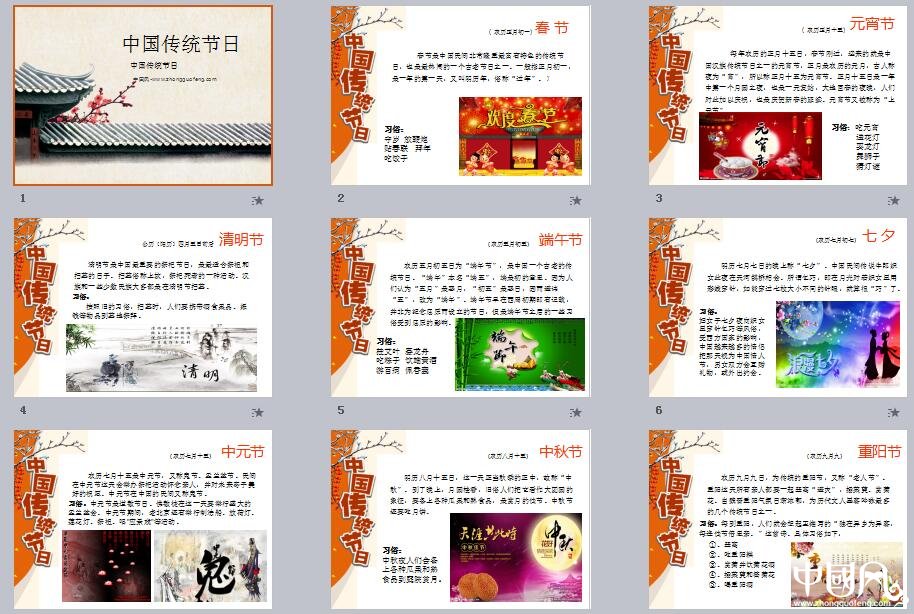 中國(guó)的傳統(tǒng)節(jié)日形式多樣,內(nèi)容豐富多樣,是我們中華民族悠久的歷史文化的一個(gè)組成部分。傳統(tǒng)節(jié)日的形成過(guò)程,是一個(gè)民族或國(guó)家的歷史文化長(zhǎng)期積淀凝聚的過(guò)程,我國(guó)的傳統(tǒng)節(jié)日,無(wú)一不是從遠(yuǎn)古發(fā)展過(guò)來(lái)的。福連文苑小編為您推薦福連文苑中國(guó)傳統(tǒng)節(jié)日PPT模板,適用于商務(wù)演講、會(huì)議報(bào)告、論文答辯等。