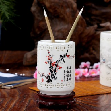 筆筒同時具備實用性和觀賞性,是書房桌案必備用品,請欣賞福連文苑小編為你帶來的精美象牙瓷鏤空筆筒?!?/p>