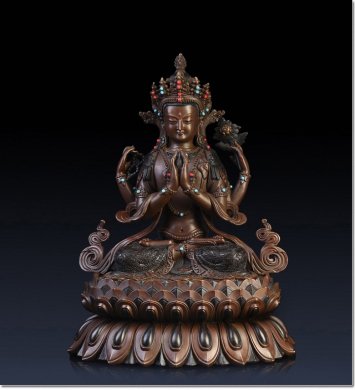 四臂觀音菩薩頭戴五佛冠,發(fā)黑色結(jié)髻,中央二手合掌放于胸前,捧有摩尼寶珠,右手持水晶念珠。左手拈八瓣蓮花與耳際齊,面貌寂靜含笑。下面福連文苑小編為你帶來純銅四臂觀音佛……
