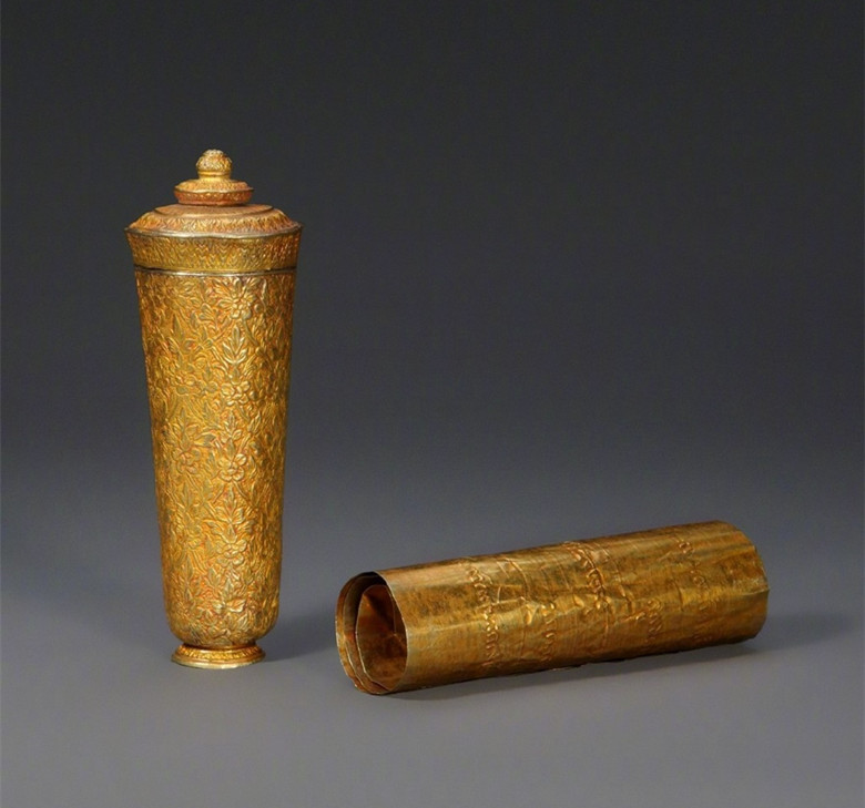 這是金筒和金箔鏨印的表文,上面的文字是現(xiàn)在的泰文,右邊的金箔可以卷起來放進(jìn)左邊的金筒中,金筒上滿是花紋非常漂亮,明朝開始,就有很多東南亞國家朝貢用這種金葉表文,現(xiàn)……