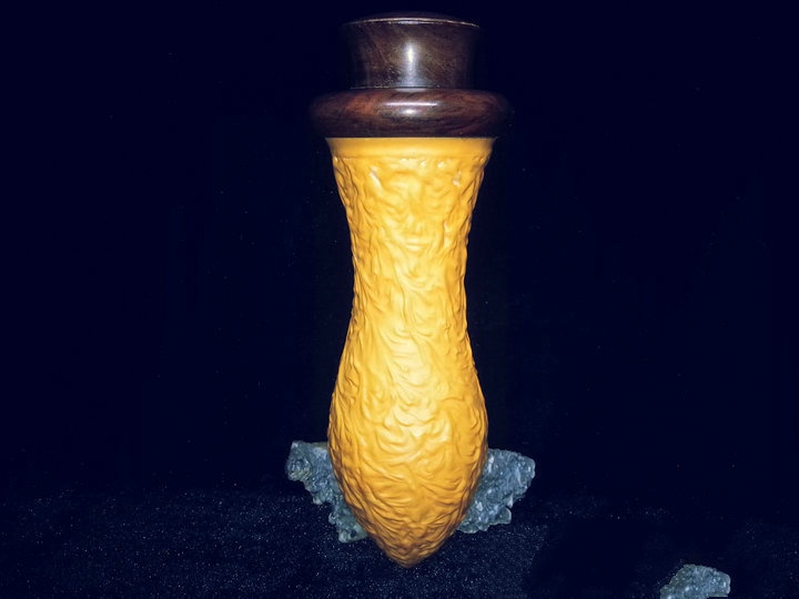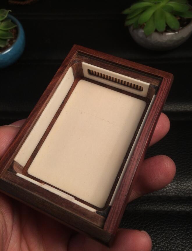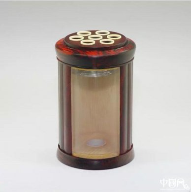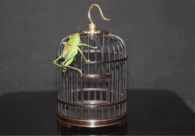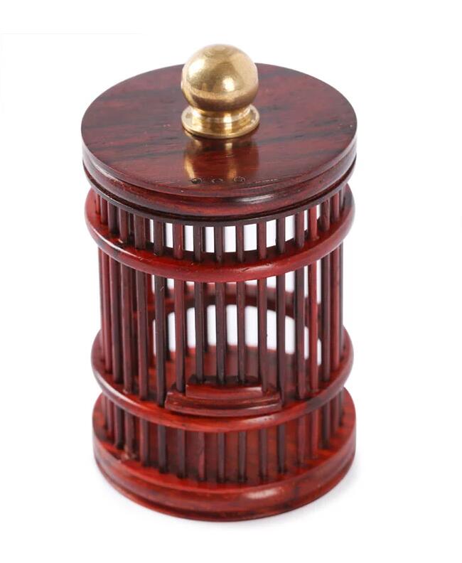 小葉紫檀口蓋,小葉紫檀筒身,竹膽,小葉紫檀蒙心,白塑料圈,白塑料封底,陳簧。明制開窗蟈蟈筒中的經(jīng)典?!?/p>