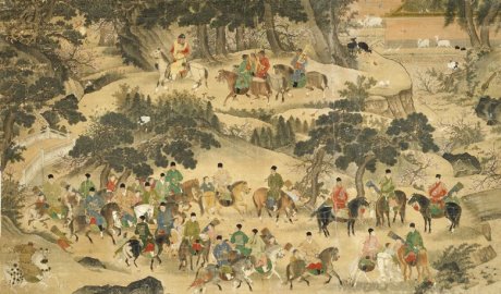 此圖繪的是明宣宗朱瞻基率眾文臣和宦官在近郊狩獵的壯觀場景。騎馬在最高處的即朱瞻基,其形略大于眾臣,表明這個時期的宮廷畫家已注意到通過構(gòu)圖來突出皇帝像,而非片面地強(qiáng)……