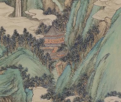 此畫圖繪了白云吞吐漂浮于山間,山谷中松林茂密,清溪流淌,隱露樓觀,境界清幽,表現(xiàn)了一派世外桃源般的仙境,畫幅右上楷書洞天山堂四字,點(diǎn)明了全畫的主題。詩堂有王鐸跋語……