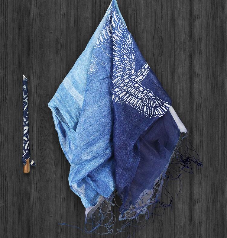 狹義的藍(lán)印花布:人們長期以來習(xí)慣于把以植物藍(lán)草為染料,用黃豆粉和石灰粉為染漿,刻紙為版,濾漿漏印的灰染藍(lán)白花布稱為藍(lán)印花布。福連文苑小編為您推薦藍(lán)印花布仙鶴展翅圍巾……