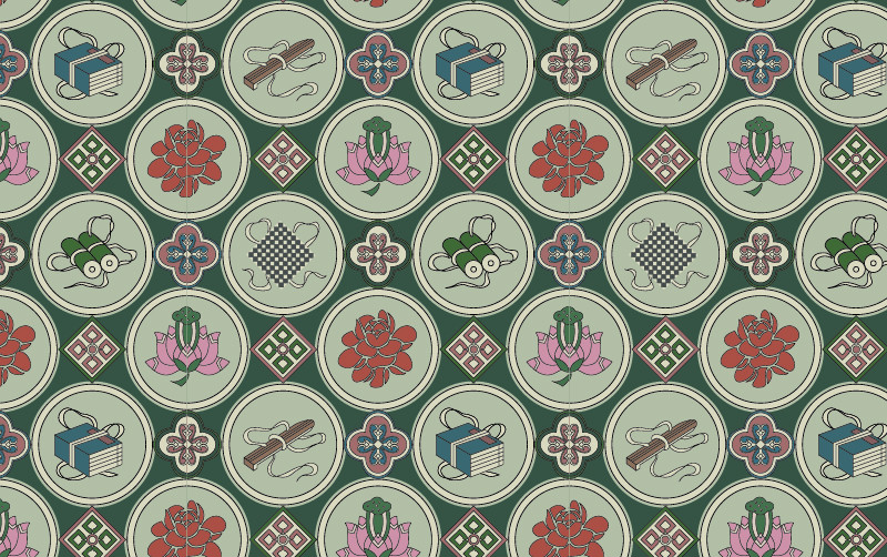 圖案中有古書、古琴、蓮花、牡丹這些中國傳統(tǒng)元素。用圓進行凸顯排列出來,整個畫面豐富多彩。中國織錦技術(shù)起源久遠,花紋絢爛,技藝成熟。在歷代織錦中以宋錦和明錦的藝術(shù)成就最高。下面福連文苑小編為你推薦中國傳統(tǒng)琴棋書畫織錦圖案與配色,矢量素材AI圖片。
