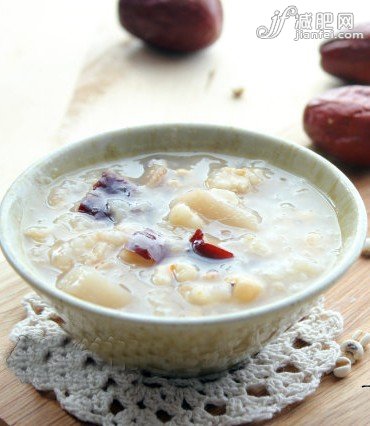 材料:薏米50克、大米50克、山藥2根、棗(干,大)10顆、水適量、老冰糖2塊