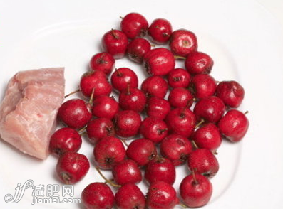 材料:瘦肉200克、山楂10個(gè)、食鹽1/2茶匙、白糖2茶匙