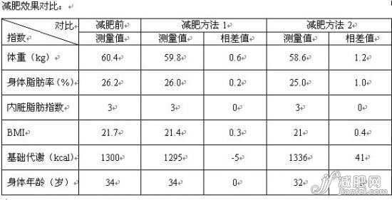 測(cè)試方法:按減肥方法1持續(xù)進(jìn)行一周的減肥,之后再按減肥方法2持續(xù)進(jìn)行一周的減肥。減肥兩周內(nèi),每天使用體重身體脂肪測(cè)量器進(jìn)行監(jiān)測(cè),記錄兩周內(nèi)的全部數(shù)值。將按減肥方法1減肥后的數(shù)據(jù)與最初測(cè)量數(shù)據(jù)進(jìn)行對(duì)比,將按減肥方法2減肥后的數(shù)據(jù)與按減肥方法1減肥后的數(shù)據(jù)進(jìn)行對(duì)比。