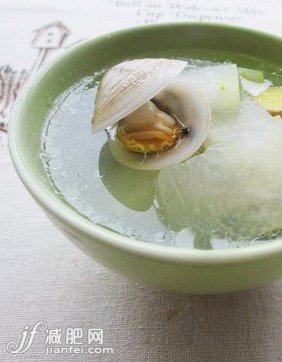 材料:帶皮冬瓜150克、蛤蜊80克、發(fā)菜50克。