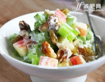 3.將切好的芹菜段、蘋果丁與核桃仁和葡萄干混合,再淋上酸奶攪拌。