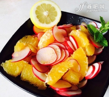 用料:櫻桃蘿卜200g、甜橙1個、白糖1小勺、橄欖油1大勺、檸檬汁、肉桂粉、薄荷葉