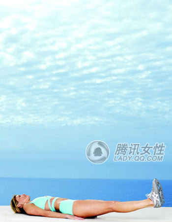雙腿向下直至距離地面六英寸處,膝蓋彎曲向胸部靠攏,然后向前伸直雙腿,右腿保持與地面平行,左腿向上伸直,垂直于地面,重復(fù)上述動作25次,然后換腿繼續(xù)練習(xí)。