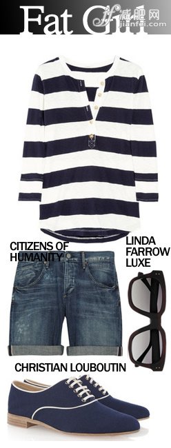 小編推薦:寬條紋V領(lǐng)衫,會(huì)讓休閑帶著性感,豐滿的MM在短褲的選擇上,可以選擇寬卷邊設(shè)計(jì)的短褲,卷邊的設(shè)計(jì)可以讓你的雙腿視覺上顯現(xiàn)修長。