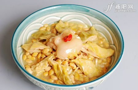 3.燒熱油鍋,放入豬蹄、姜片爆炒,盛入砂鍋內(nèi),加入黃豆和適量清水,用小火燉30分鐘,加入食鹽、味精、芹菜、蔥和胡椒粉即可。