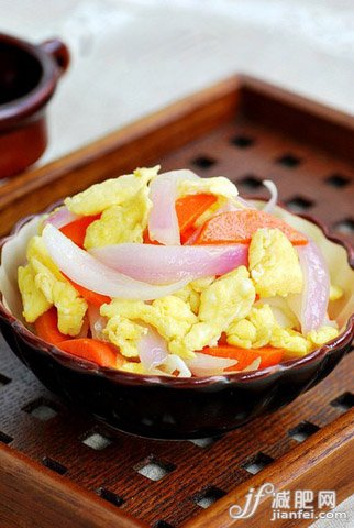 2,鍋內(nèi)倒入少許的植物油,然后把雞蛋倒入翻炒成金黃色后立即撈出。接著把洋蔥絲下鍋,翻炒成透明狀后再次倒入雞蛋翻炒兩下就可以出鍋了。