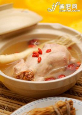 作法:雞腿切塊入熱水中川燙、撈起瀝干。黃耆、茯苓、紅棗清水沖凈。將上述加6碗水熬湯,大火開(kāi)后轉(zhuǎn)小火煮約25分鐘,加料酒及鹽調(diào)味,起鍋前加入蒟蒻絲(零熱量、有飽漲感)即可食用。