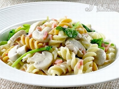 材料:三色螺旋面100克、蘑菇100克、菠菜100克、火腿片50克、洋蔥半個、蒜頭3瓣、淡奶油100克、鹽2克、白胡椒粉2克。