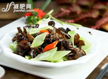 食材:萵筍500克,黑木耳(干)50克,大蒜(白皮)5克,大蔥5克,姜、泡椒、味精、鹽、香油、植物油各適量。