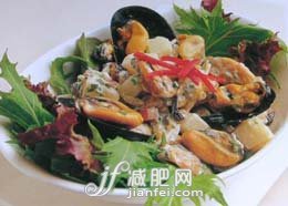 材料:中等大小的蝦300g,墨魚1只,巴非蛤300g,牡蠣4個,色拉用蔬菜(菊苣,洋生菜,紅色卷心菜,紅色菊苣),葡萄酒2大匙,檸檬1/4個,大蒜調(diào)味汁。