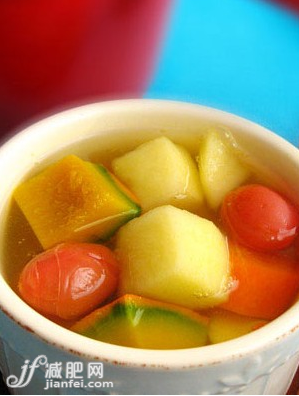 材料:小番茄300克、小南瓜1個、紅蘿卜1根、富士蘋果一個、清水800克、蜂蜜1大勺。