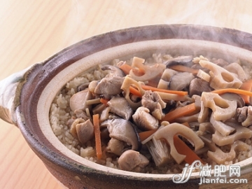 燒熱油鍋,放入胡蘿卜、蘑菇翻炒,注入清湯,用中火煮至胡蘿卜熟爛。