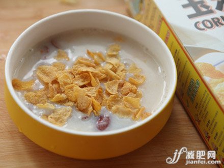 3、依自己的喜好適量加入牛奶,并放入提子、杏仁片和蜂蜜。