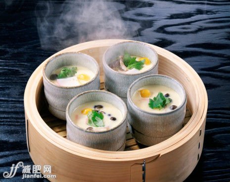 材料:雞蛋4個、水3杯半、蔥粒1茶匙、鹽1/2茶匙、酒1/4茶匙