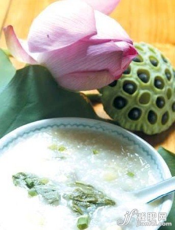 用鮮荷葉1張(約200克)、粳米100克、白糖適量為原料。將米洗凈,加水煮粥。臨熟時將鮮茶葉洗凈覆蓋粥上,燜約15分鐘,揭去荷葉,粥成淡綠色,再煮沸片刻即可。服時酌加白糖,隨時可服。能清暑,生津,止渴,降脂減肥。