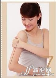 手臂保持彎曲狀態(tài),另一手握住手臂外側(cè)肘關(guān)節(jié)處,從關(guān)節(jié)處手掌順勢向上按摩。