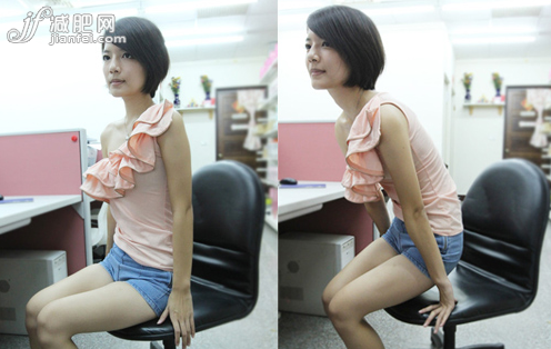 椅子呈現(xiàn)半坐狀態(tài)(勿靠著椅背),雙手扶在椅子兩側(cè)。