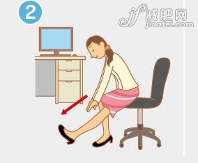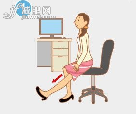 ?、僖巫硬灰锰?,坐椅子的3分之1的位置,挺直腰桿。同時左腳向前伸,腳后跟貼著地板,腳掌與小腿呈90度角,內(nèi)膝蓋往下壓,把小腿肚和大腿后側(cè)的肌肉拉緊。
