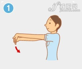 ①坐在椅子上,掌心向上,手臂向前直伸。用右手輕握左手拇指以外的四根手指,用力把手向下掰。左右手交替做上述動作。