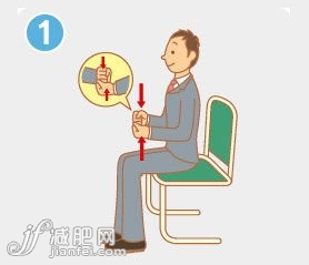 ①坐在椅子上,伸直腰桿,挺胸收腹。兩手緊握成拳頭狀,手腕上下交叉運(yùn)動(dòng)。