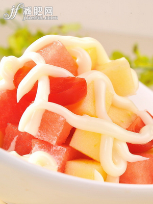 材料:哈密瓜150克,西瓜150克,蘋(píng)果1個(gè)、菠蘿1小塊,香蕉1根,櫻桃適量,草莓汁適量。蜂蜜1湯匙,蛋黃醬少許,沙拉醬適量。