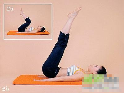B、 雙臂放在身體兩側,手掌朝下。將雙腿伸直,并慢慢抬起,收縮腹部肌肉,注意腳尖繃緊。