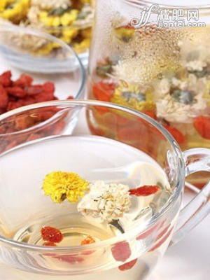 做法:將菊花放入水中煮沸;將榨汁的檸檬和綠豆沙的汁注入菊花水中攪拌,放入少量蜂蜜即可飲用。