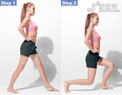 Step 1 雙手插腰,雙腳一前一後,做弓箭步預(yù)備動(dòng)作。