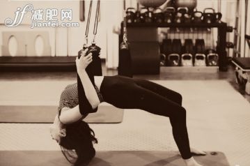江疏影利用彈力帶的作用,將身體重心放于腰部,上身后仰,拉伸腰部的肌肉。
