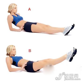 仰躺在墊子上,將手放在胯部,以手肘做支撐將上身抬起(A圖)。然后將背部壓向地面,盡量與腹部在同一直線上,雙腿并攏,抬離地面約45度。雙腿伸直,腳尖繃緊,將腿沿順時針畫圈12次,再逆時針畫12次(B圖)。這個動作可以起到很顯著的瘦腿作用,同時還能減掉腹部多余脂肪。
