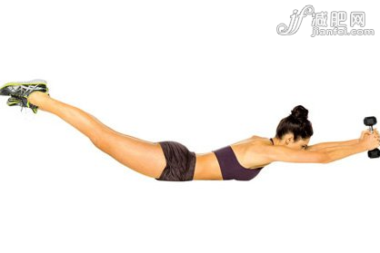 面朝下躺下,雙腿伸展,雙手各拿一個(gè)啞鈴,雙臂向前伸展