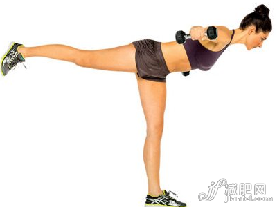 左腳著地,右腿向后伸直,背部平行地面,雙手各拿一個(gè)啞鈴,兩臂垂直地面