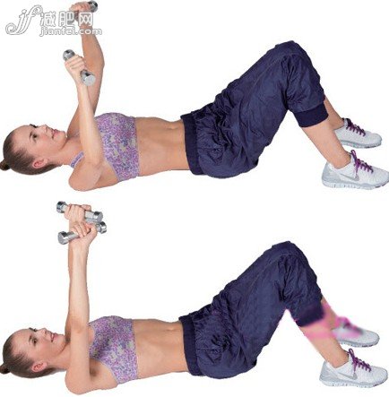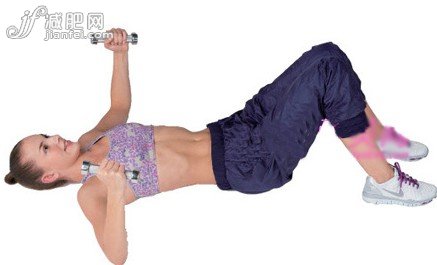 Step 4 內(nèi)收大胸肌:1、屈膝躺臥,左右膝蓋并攏,小腿與腳掌張開,同樣腰腹收緊,兩手握著啞鈴,手肘彎曲,兩肩與上臂打開并貼于地面,下臂舉起,分別垂直地面。