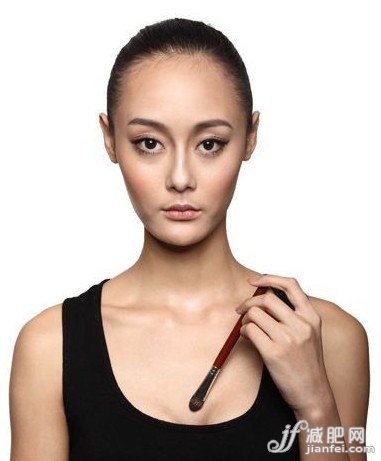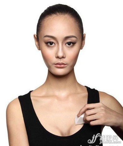 Step2:用高光亮粉在兩個(gè)胸部中間刷上提亮粉,可適當(dāng)根據(jù)胸型畫一個(gè)類似倒三角一樣的扇形面積。