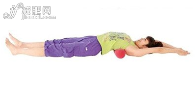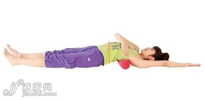 tips:骨盆枕的位置,想象左右乳尖點達成一條線,心形圖案對準線條中心點的正后方,將骨盆枕橫放在胸部肩胛骨下放的位置,并確實固定。