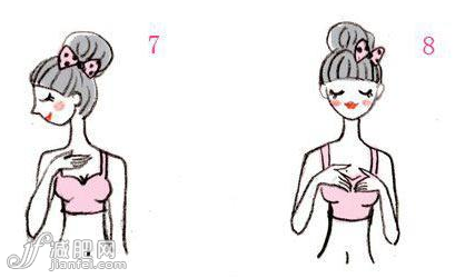 5、用手掌有節(jié)奏地交替上推按摩兩邊胸部各15秒,再用手托住胸部來回按摩約10秒。