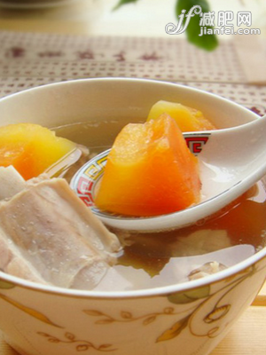 2、老姜洗凈切片,將木瓜、排骨、老姜放入開(kāi)水鍋中,小火煲3 小時(shí),加鹽調(diào)味即可。