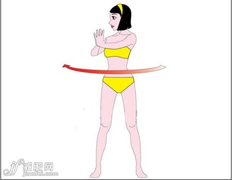 下半身保持不動,吐氣慢慢右轉(zhuǎn),感覺到腰腹部旋轉(zhuǎn)的力量。雙腳跨度要與肩同寬,過寬或過窄會影響之后做動作的效果。