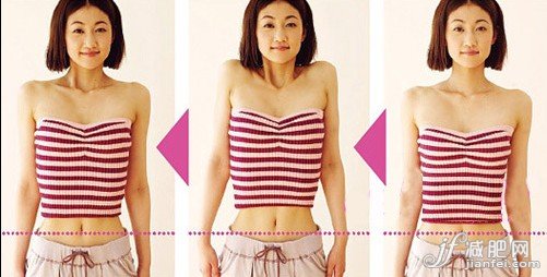 Step 2:站在鏡子前,雙肩放下,挺直上身,然后雙肩聳起,收緊腰腹,在保持腰腹的狀態(tài)下,放下雙肩。如雙肩聳起后,肚臍的位置不變,則腰腹肌力低下;如雙肩聳起,肚臍上移,放下雙肩后肚臍下移,則腰腹肌力輕微下降;雙肩放下后,肚臍的位置不下移,則代表腰腹肌力優(yōu)良。