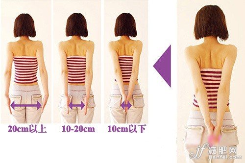 Step 3:上身挺直,雙臂向后伸直,手指交叉握緊。然后雙掌張開合十,并慢慢向外側(cè)拉開手臂。保持手臂的伸展?fàn)顟B(tài),雙掌分開后相距10cm以內(nèi),表示背部肌力較強(qiáng);雙掌相距10-20cm的,背部肌力稍弱;雙掌分開后,手臂不自覺地彎曲分開,幅度大于肩寬,手掌相距20cm以上,則背部肌力很弱。