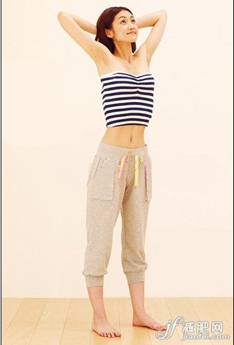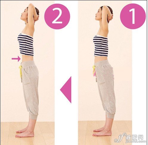 瘦腰呼吸法:雙腿分開(kāi)至與肩同寬而站立,上身挺直,與大腿成一直線,雙臂舉起,手肘彎曲,雙手抱于后腦,深深吸氣,帶動(dòng)胸廓外擴(kuò),腰腹肌肉向上提拉,腹部凹陷,保持20秒。然后從鼻子呼氣,充分放松肌肉,腹部再次鼓起。